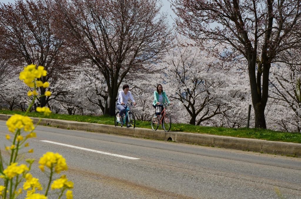自転車で飯山駅方面へ戻ります。途中にはまたもやフォトスポットになる桜並木が。
